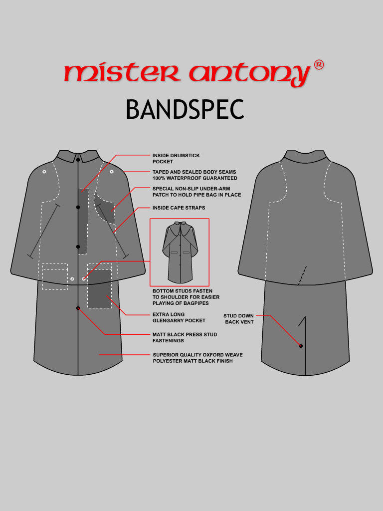 The BandSpec Rain Cape is a high-quality, practical garment designed to offer reliable protection in all weather conditions. Built with durability and comfort in mind, it is ideal for bandsmen, outdoor use, and everyday wear.