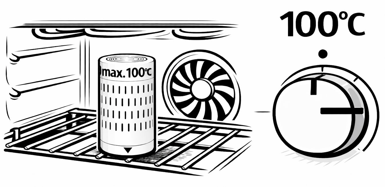 The canisters are made from High Temperature PLA (polylactide) with heat resistant magnets. You can put the complete canister straight into the oven at 80 to 100°C. No need to empty the silica gel out.